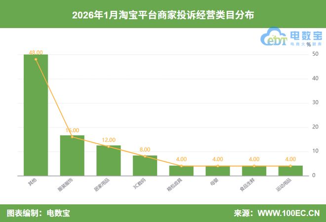 1月,投诉淘宝平台的商家经营类目TOP3依次为服装服饰(16.00%)、居家用品(12.00%)、3C数码(8.00%)。