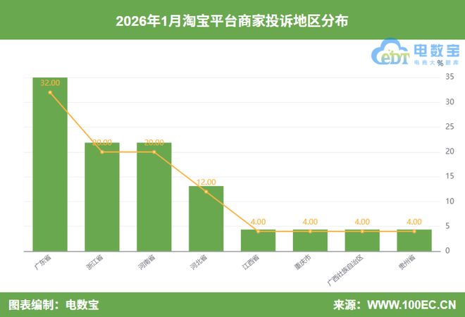 1月,投诉淘宝平台的商家注册地区TOP4依次为广东省(32.00%)、浙江省(20.00%)、河南省(20.00%)、河北省(12.00%)。